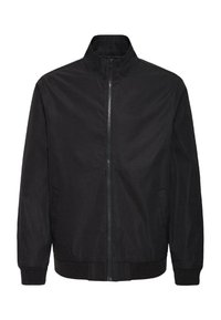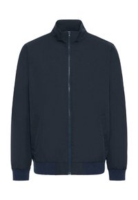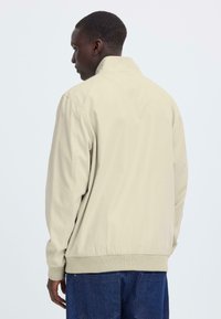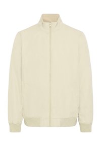 Jeune homme portant une veste beige clair à fermeture éclair avec poignets et ourlet côtelés, assortie à un jean bleu foncé, sur un fond uni.