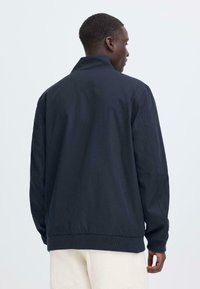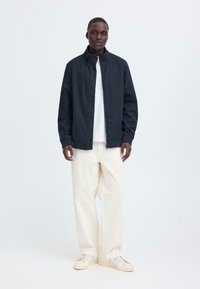 Homme portant une veste zippée bleu marine avec des poignets et un col côtelés, debout avec une main dans la poche de son pantalon beige clair, regardant vers le bas sur le côté.