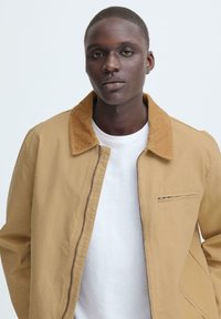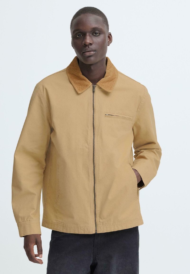 Homme portant une veste zippée beige avec un col en velours côtelé marron, debout avec une main dans la poche, sur un fond clair uni.