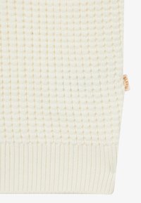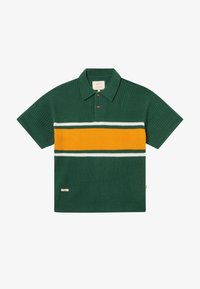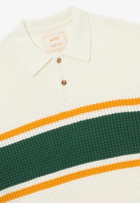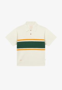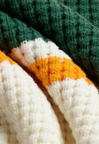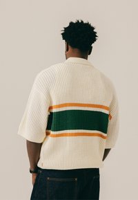 Homme aux cheveux courts et bouclés portant un pull en maille crème avec des rayures vertes et orange, debout avec les mains derrière le dos devant un fond uni.