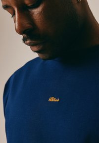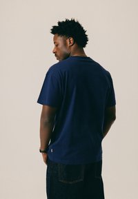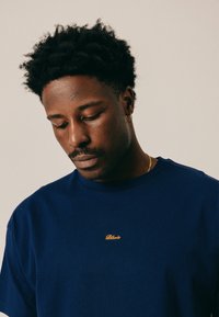Homme aux cheveux courts et bouclés, portant un t-shirt bleu marine, un jean foncé, une montre-bracelet et une chaîne en or, debout devant un fond beige uni.