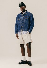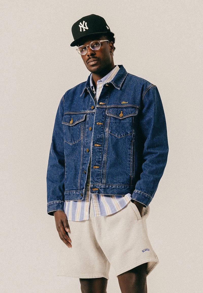 Homme portant une casquette noire des New York Yankees, des lunettes, une veste en denim bleu, une chemise rayée et un short beige, les mains dans les poches, sur fond uni.