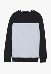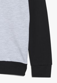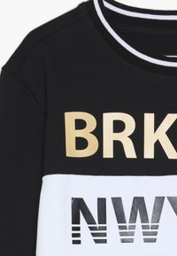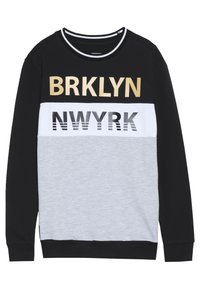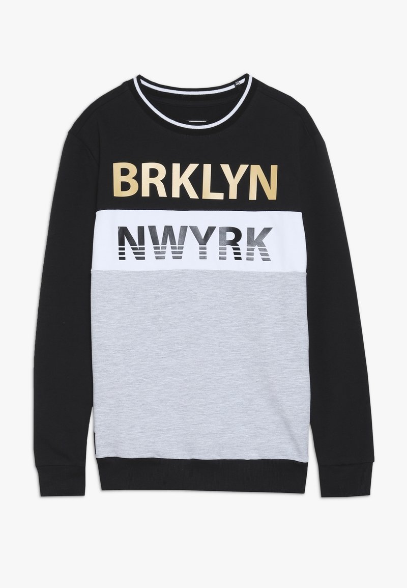 Sweatshirt à manches longues avec col rond, présentant des blocs noirs, blancs et gris ; texte doré "BRKLYN" et texte noir rayé "NWYRK" à l'avant.
