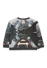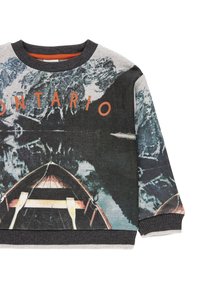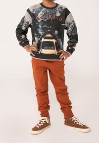 Sweat-shirt noir et gris avec un graphisme de canoë et le texte "ONTARIO", accompagné d'un pantalon de jogging orange et de baskets montantes marron.