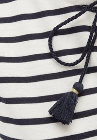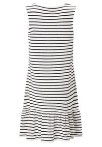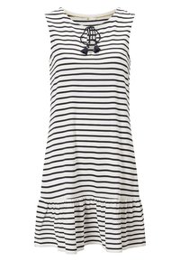 Robe blanche sans manches à rayures noires horizontales, col en trou de serrure avec des liens à pompons noirs, et un ourlet à volants.