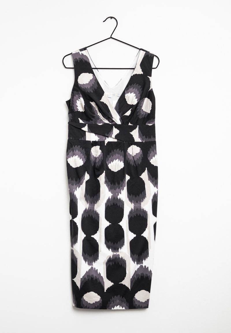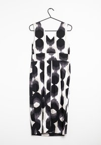 Robe noire et blanche sans manches, longueur aux genoux, décolleté en V profond avec motif circulaire abstrait, suspendue à un cintre en fil noir.