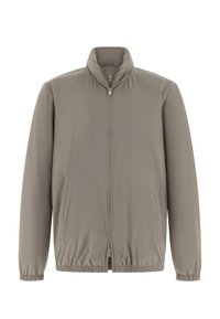 Veste zippée légère grise avec col montant, poignets élastiques et poches latérales. Texture lisse et design minimaliste.