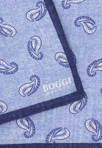 Pochette bleu clair à motifs de petits dessins paisley bleu foncé avec une bordure bleu foncé, étiquetée "BOGGI" dans un coin.