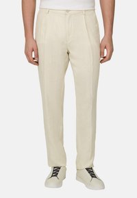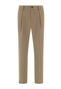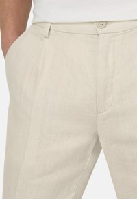 Homme portant un pantalon beige sur mesure et des baskets assorties avec des lacets noirs, debout devant un fond uni.