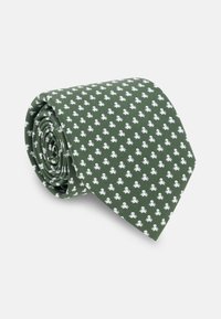 Cravate vert foncé avec un petit motif de fleurs de lys blanches, posée à plat avec l'étiquette visible sur l'extrémité étroite.