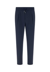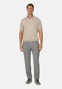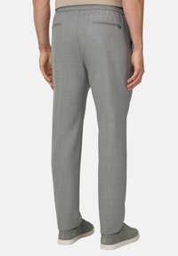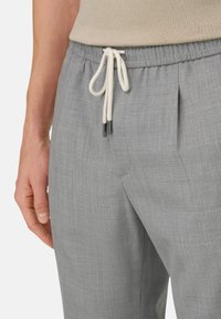 Homme portant un pantalon gris clair à cordon de serrage et des baskets grises, debout devant un fond uni.