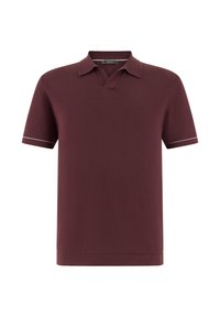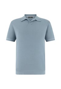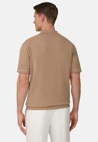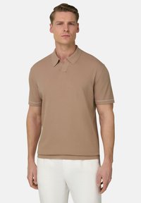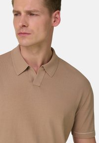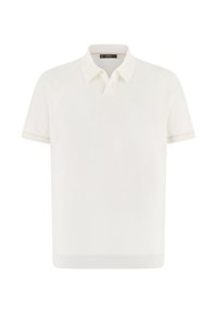 Homme portant un polo à manches courtes beige avec un pantalon blanc, debout devant un fond blanc uni, regardant vers l'avant avec une expression neutre.