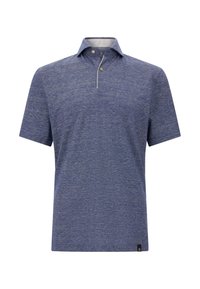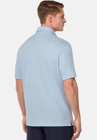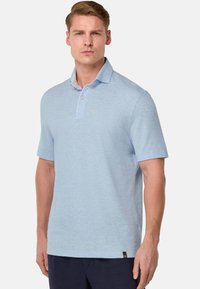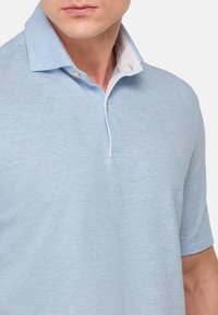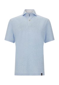 Polo bleu clair avec un col court, une patte de boutonnage à trois boutons et une texture douce. Détail de tag notable au niveau de l'ourlet.