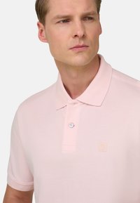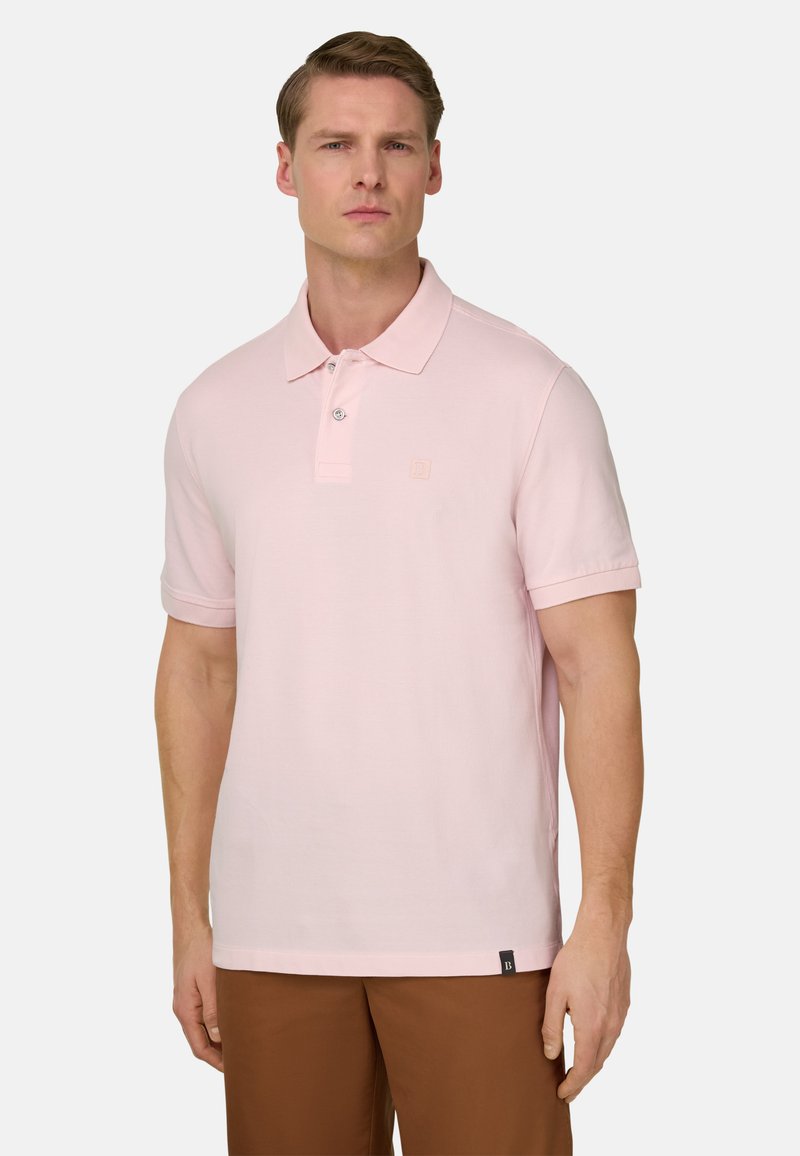 Polo en coton rose doux avec une patte de boutonnage à deux boutons, un bord de col blanc et un petit logo carré sur la poitrine gauche.