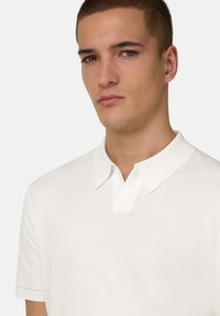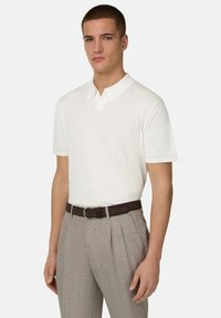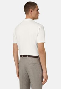Homme portant un polo blanc à manches courtes rentré dans un pantalon beige à plis avec une ceinture en cuir marron foncé, debout devant un fond uni.