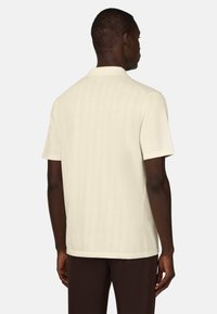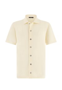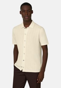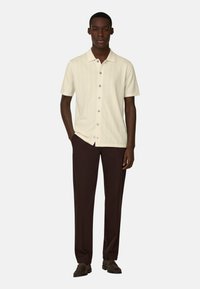 Homme portant une chemise crème à manches courtes avec col et boutons, associée à un pantalon marron foncé, debout devant un fond uni.