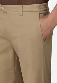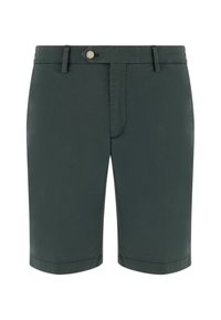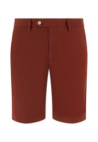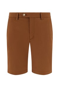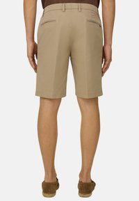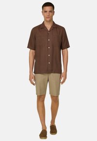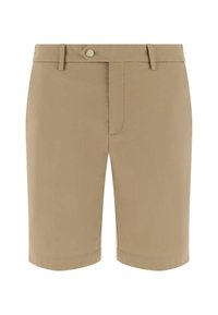 Short beige sur mesure porté avec des mocassins marron sans lacets, montré de la taille aux pieds sur une personne debout sur fond blanc.