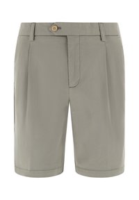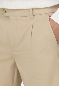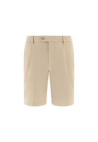 Homme portant un short beige sur mesure avec passants de ceinture, plis sur le devant et fermeture par bouton, assorti à des espadrilles marron à enfiler.