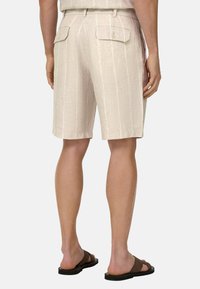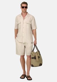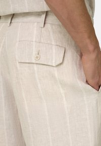 Shorts en lin beige à fines rayures blanches verticales portés par une personne debout, les mains dans les poches et des sandales marron aux pieds.