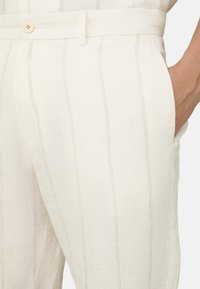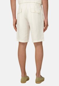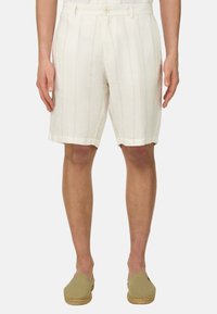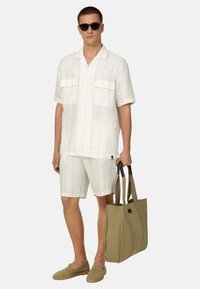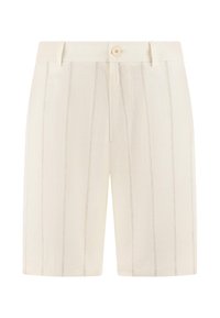Homme portant un short écru à fines rayures avec bouton et fermeture éclair, associé à des chaussures beige sans lacets, debout devant un fond uni.
