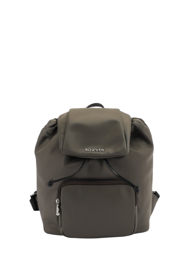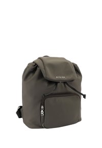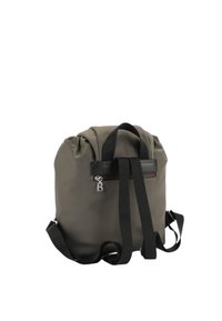 Sac à dos vert olive en tissu durable avec un haut resserré, une poche zippée à l'avant et des accents noirs. Présente une texture douce.