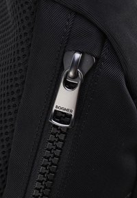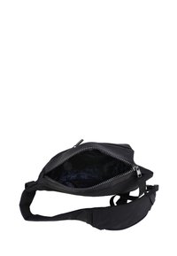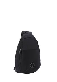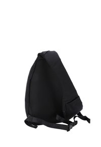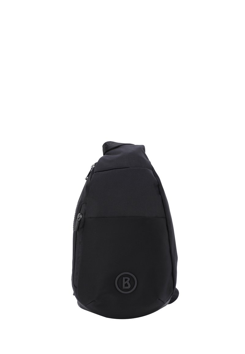 Sac à dos en bandoulière noir avec une sangle, doté de compartiments zippés et d'un logo circulaire avec la lettre "B" sur la poche avant.