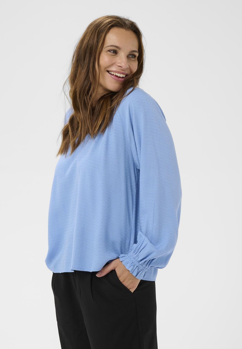 Haut bleu clair texturé avec des manches longues, des poignets élastiques, une coupe décontractée et un col rond, associé à un pantalon noir.