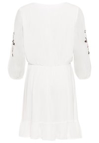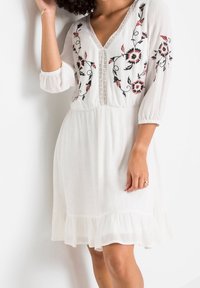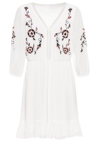 Robe blanche avec des motifs floraux brodés en rouge et noir, décolleté en V, manches trois-quarts et ourlet volanté. Texture lisse.