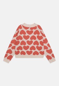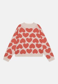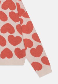 Pull en maille avec une base crème et de grands motifs de cœurs roses. La texture est douce et il a un col large et confortable.