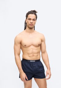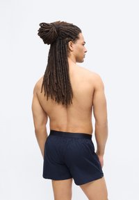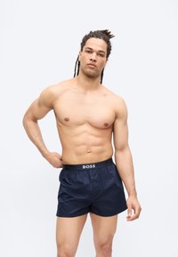 Homme torse nu avec de longues dreadlocks portant un boxer noir BOSS, debout devant un fond gris clair uni.