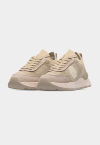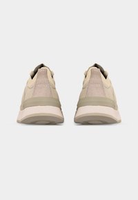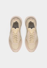Baskets en mesh beige clair avec lacets flottant au-dessus de carreaux en bois à l'extérieur, avec une plante verte et un mur en béton en arrière-plan.