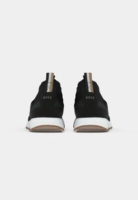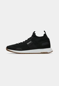 Baskets BOSS noires avec semelle blanche à motifs, flottant au-dessus d'un sol en bois et carrelage en pierre à l'extérieur, à côté d'un petit arbre.