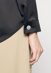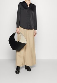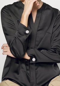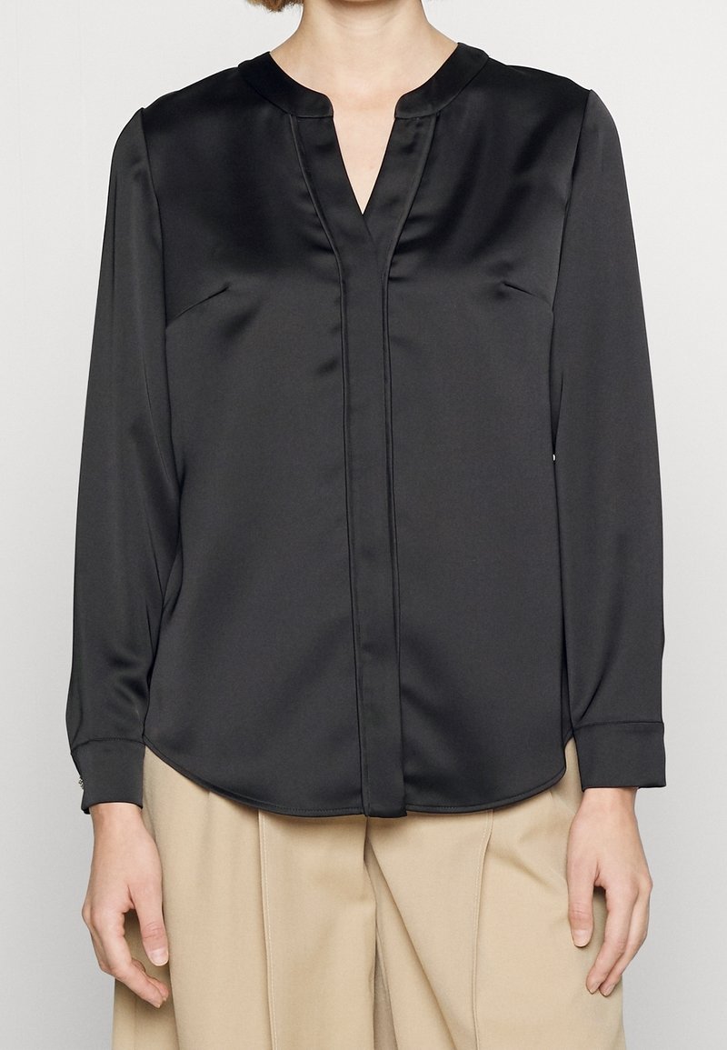 Blouse noire en satin à manches longues, col en V avec boutons avant cachés, portée avec un pantalon plissé beige.