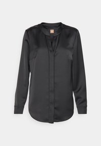 Chemise noire à manches longues avec un décolleté en V et des boutons sur le devant. Fabriquée dans un tissu lisse, avec des poignets structurés et une coupe décontractée.