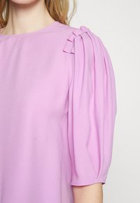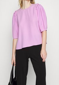 Haut lilas à manches courtes avec détail froncé aux épaules, porté avec un pantalon noir à jambes droites. Porte un sac à main noir matelassé et des escarpins noirs.
