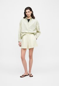 Femme aux cheveux bouclés foncés portant une chemise ample à rayures vert pâle sur un haut noir et un short à taille élastique de couleur crème, sur fond blanc.