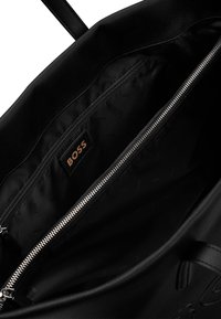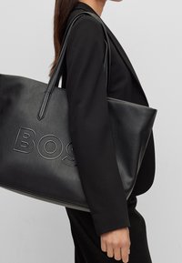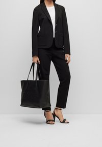 Femme portant un blazer noir, un pantalon noir et des sandales à talons hauts noires, tenant un grand sac fourre-tout noir avec l'inscription "BOSS" en relief.