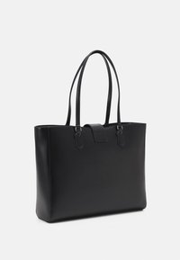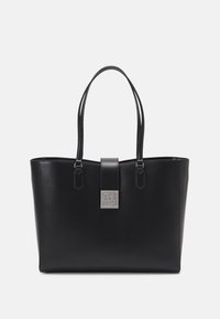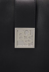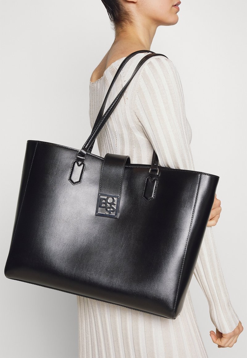 Femme portant une robe blanche côtelée, tenant un grand sac fourre-tout en cuir noir avec des poignées doubles et une plaque métallique avec le logo Boss.
