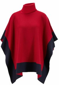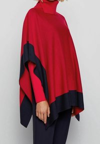 Personne portant un poncho rouge et bleu marine avec un col roulé rouge en dessous, un pantalon bleu marine, et les mains détendues le long du corps.