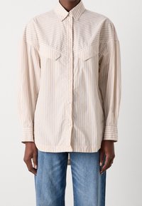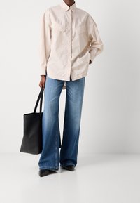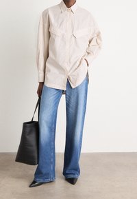 Chemise à manches longues couleur crème avec col pointu, boutonnée sur le devant et coupe ample. Tissu lisse avec un léger éclat.