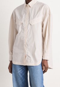 Personne portant une chemise ample à rayures beige et blanche avec des poches sur la poitrine, associée à un jean en denim bleu, debout devant un fond uni.