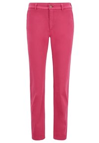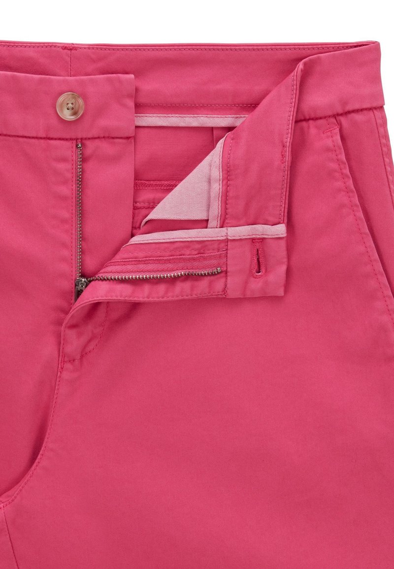 Pantalon en coton rose avec fermeture éclair, bouton, et détails de doublure intérieure contrastante. Texture lisse avec une coupe ajustée.