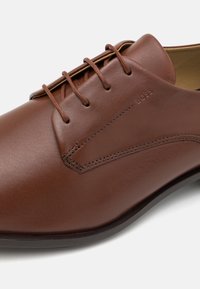 Chaussure habillée pour homme en cuir marron avec laçage fermé, finition lisse, talon bas et marque discrète embossée près des lacets et de la semelle.