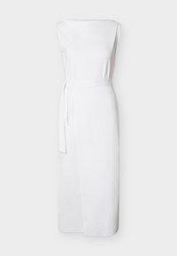 Femme aux longs cheveux foncés portant une robe midi noire sans manches et des chaussures blanches à talons pointus, debout devant un fond clair uni.
