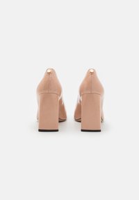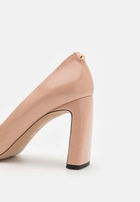 Escarpin à talon haut en cuir verni nude avec un bout arrondi, un design élégant et un talon carré ; présente un subtil accent doré à l'arrière.