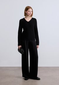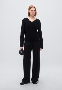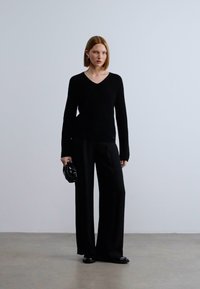 Pull noir à col en V en matériau doux, associé à un pantalon tailleur sombre doté de poches latérales et de détails en boutons.