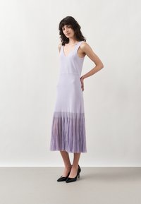 Femme aux cheveux bouclés et foncés portant une robe violette claire sans manches avec une jupe plissée, debout devant un fond blanc uni.