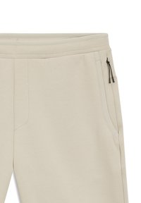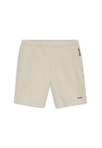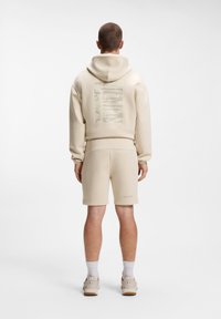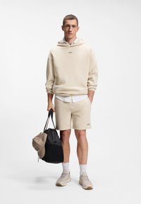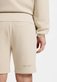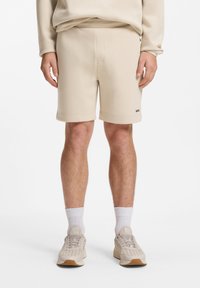 Homme portant un short beige décontracté assorti à des baskets de la même couleur et des chaussettes blanches, debout devant un fond uni.