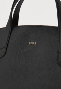 Sac cabas en cuir noir avec double poignée, bandoulière amovible et petit logo doré "BOSS" centré sous les poignées.