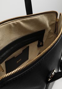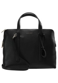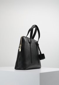 Sac à main en cuir noir avec double poignée et bandoulière amovible, posé sur un piédestal blanc devant un fond uni.
